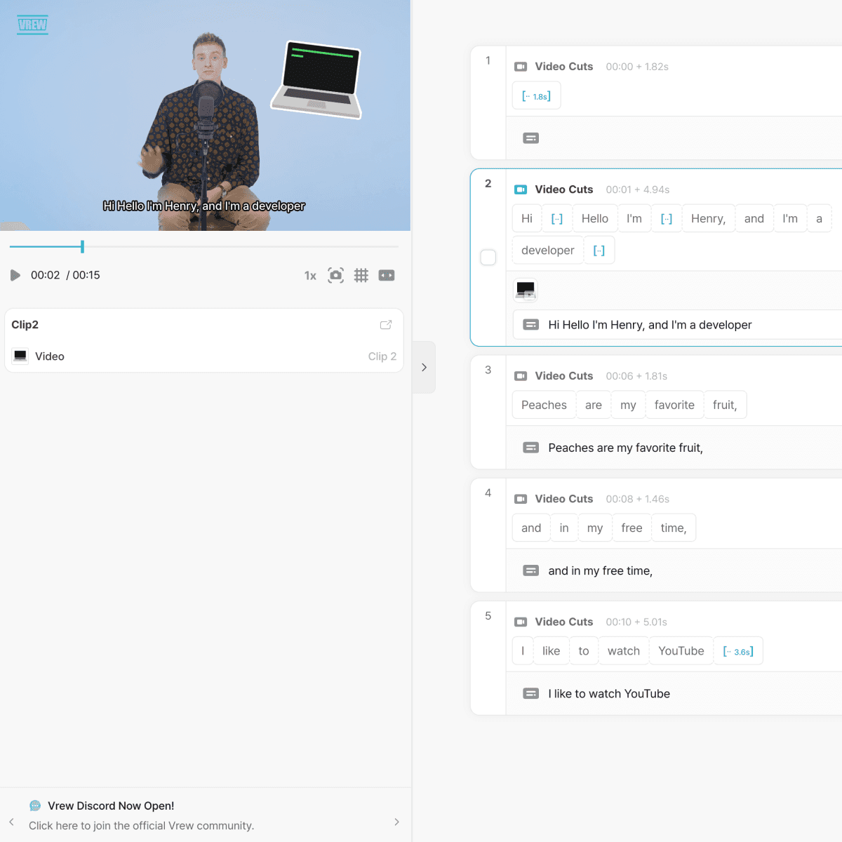 Vrew lets you edit your video by editing the transcribed text. Simply delete the text to remove that part of the video.