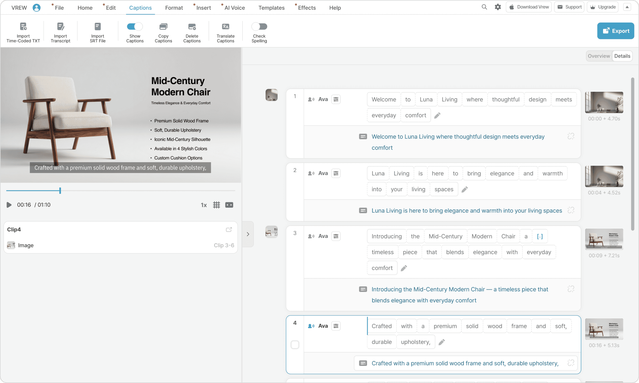 Upload existing presentation materials, and Vrew transforms them into dynamic videos with captions and AI voices. Instead of static PDFs, teams can deliver engaging promotional videos that stand out.