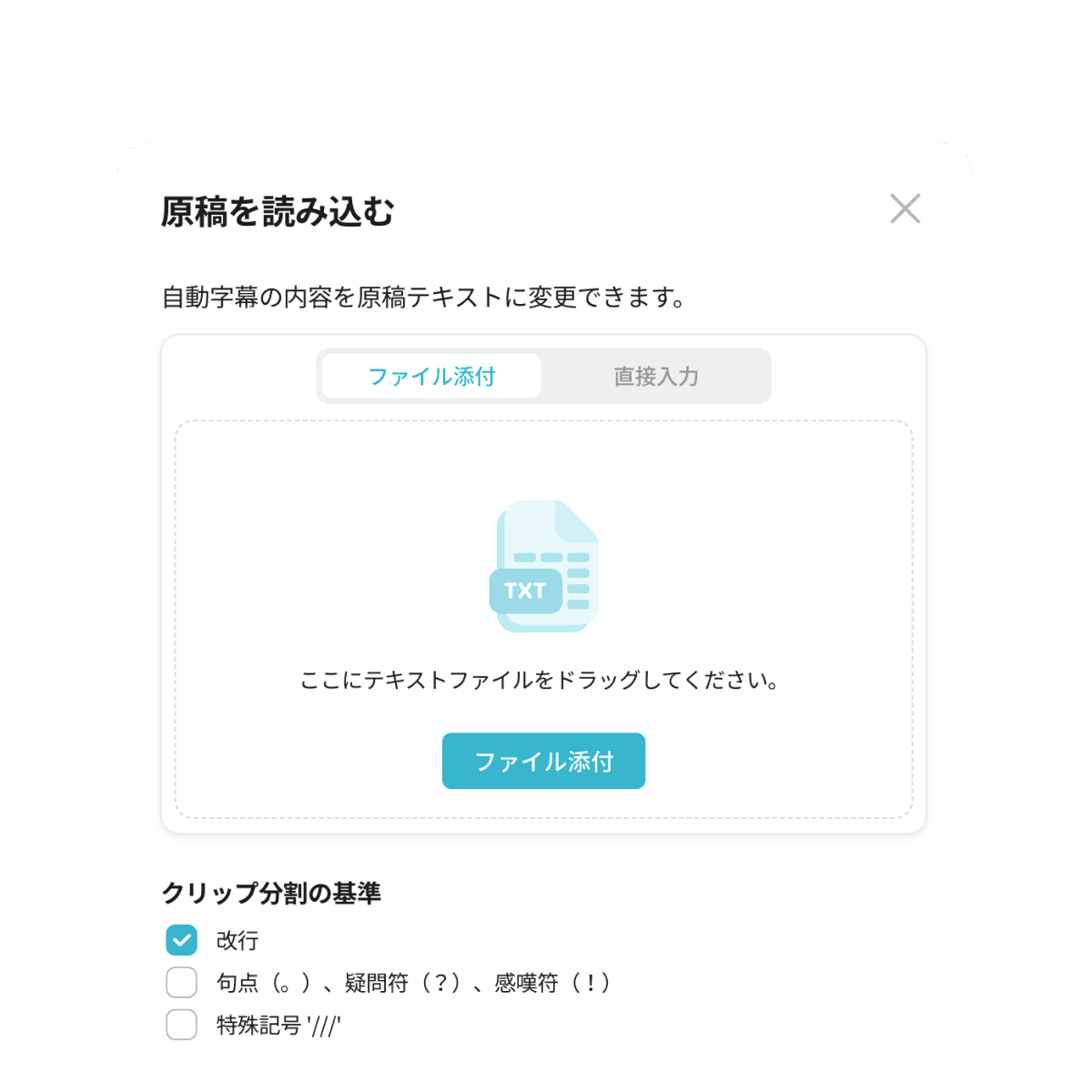 原稿を読み込んで、AIが自動で分析したプロジェクトに追加できます。既に生成された字幕にも原稿やテキストファイルをアップロードし、