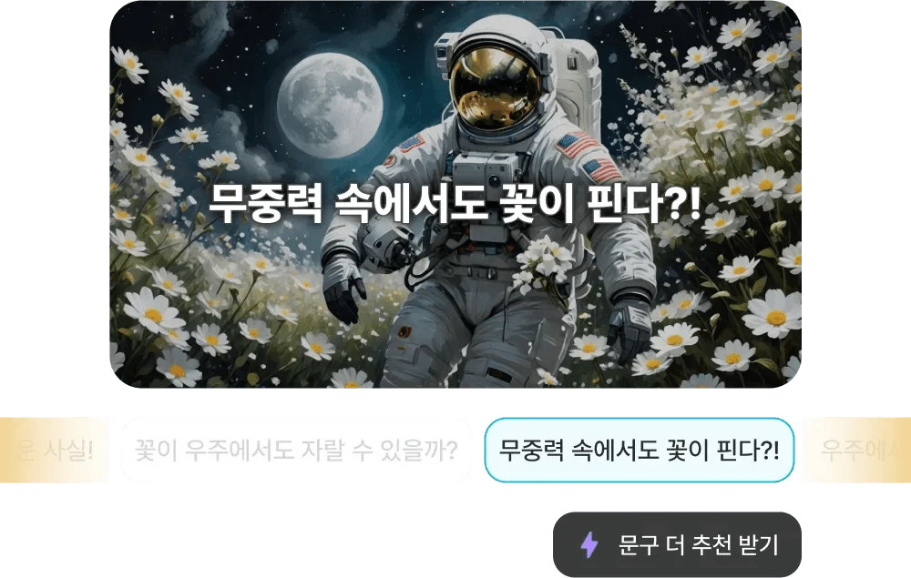 우리 회사에 딱 맞는 영상 제목을 찾기 위해 고민하는 분들을 위해 썸네일 문구를 계속해서 추천해 주는 서비스를 무제한으로 사용하실 수 있고요. 이미지와 디자인도 주제에 딱 맞게 수정해 줍니다.