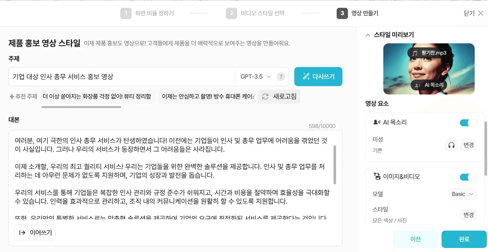 원하는 주제를 적고 AI 글쓰기를 적으면, 기본적인 영상 흐름을 잡아볼 수 있고요. 여기에서 우리 회사의 제품이나 서비스에 맞게 대본을 수정하면 됩니다. 콘티를 작성할 수 있는 인력이 없는 회사도, 서비스 소개 영상을 만드는데 시간이 부족한 회사도 쉽게 시도해 볼 수 있죠.