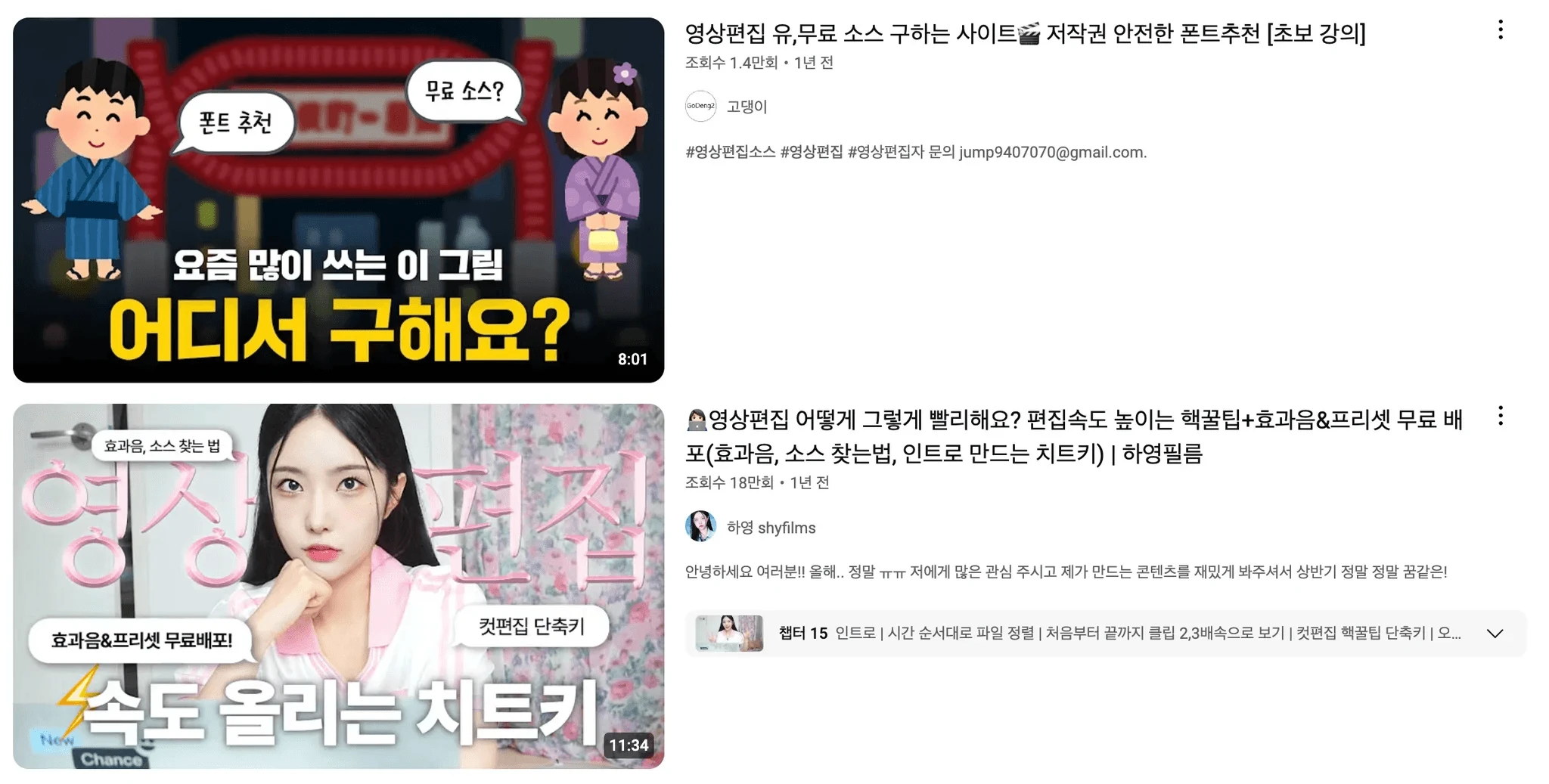 유튜브 검색에 ‘영상 편집 소스’를 검색하면 다양한 인사이트를 찾을 수 있습니다.
