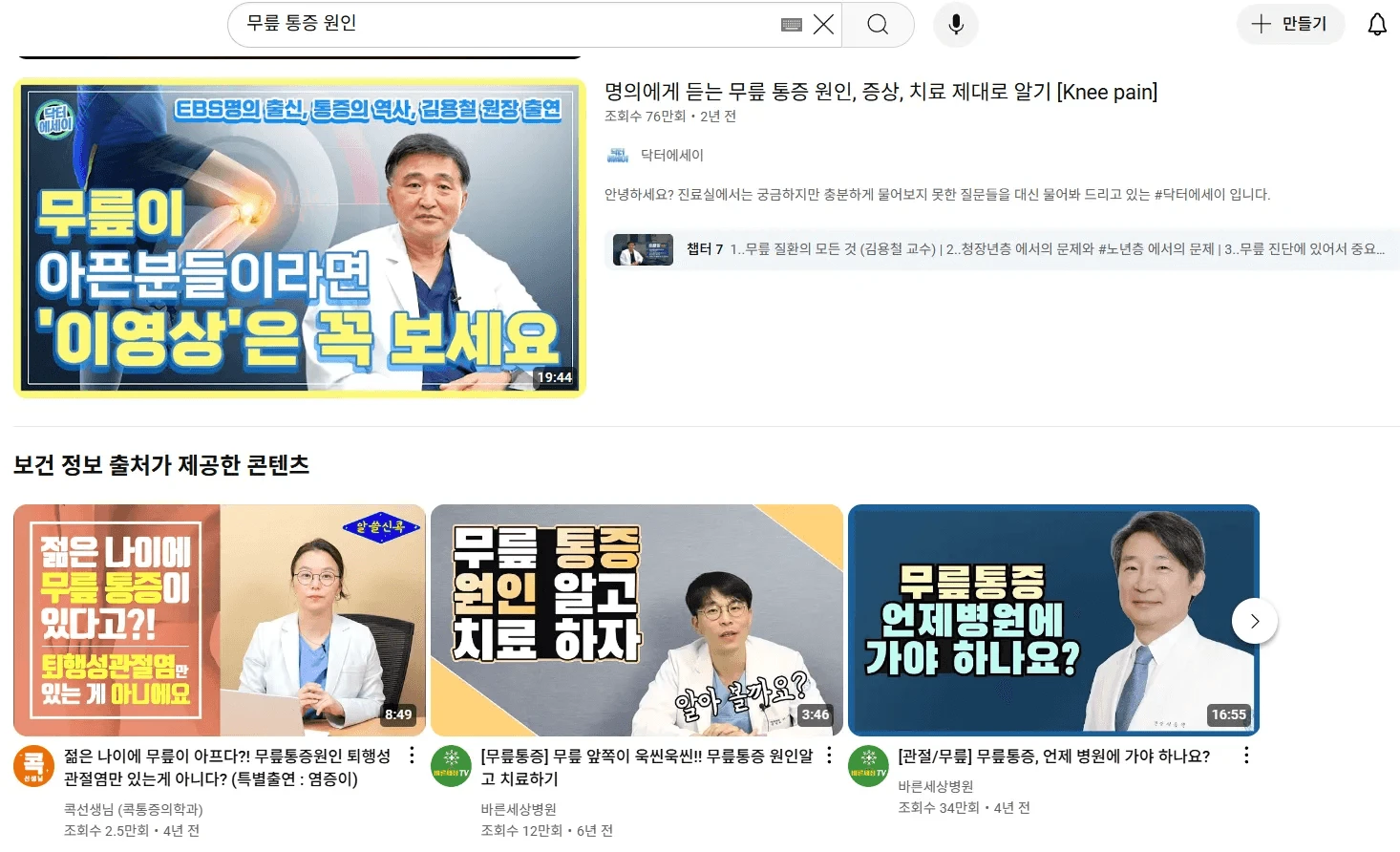 예를 들어 "무릎 통증 원인"을 검색한 환자가 병원의 유튜브 영상을 본다면, 단순히 비슷한 키워드 광고 문구를 보는 것보다, 유튜브 영상이 더욱 눈에 띄고 신뢰도가 높겠죠.