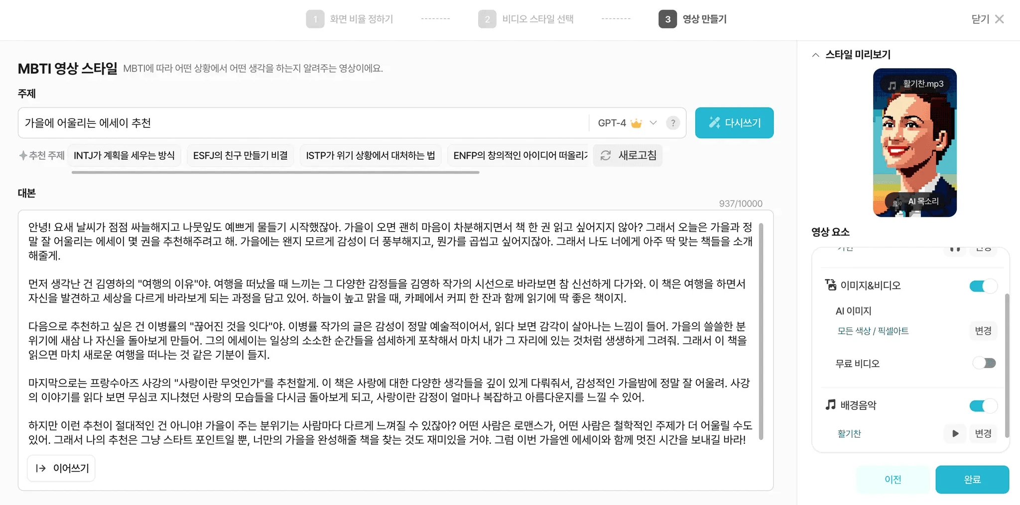 정보전달, 회화 공부, 명언, 다큐멘터리, 뉴스, 어린이 학습, 책 리뷰 등 영상 목적에 맞는 스타일을 선택한 뒤, 영상의 대본을 입력하면 AI가 자동으로 영상을 생성해 줍니다. 이때 영상 대본을 읽어줄 AI 목소리와 어울리는 배경음악도 별도로 설정하거나 수정할 수 있습니다.