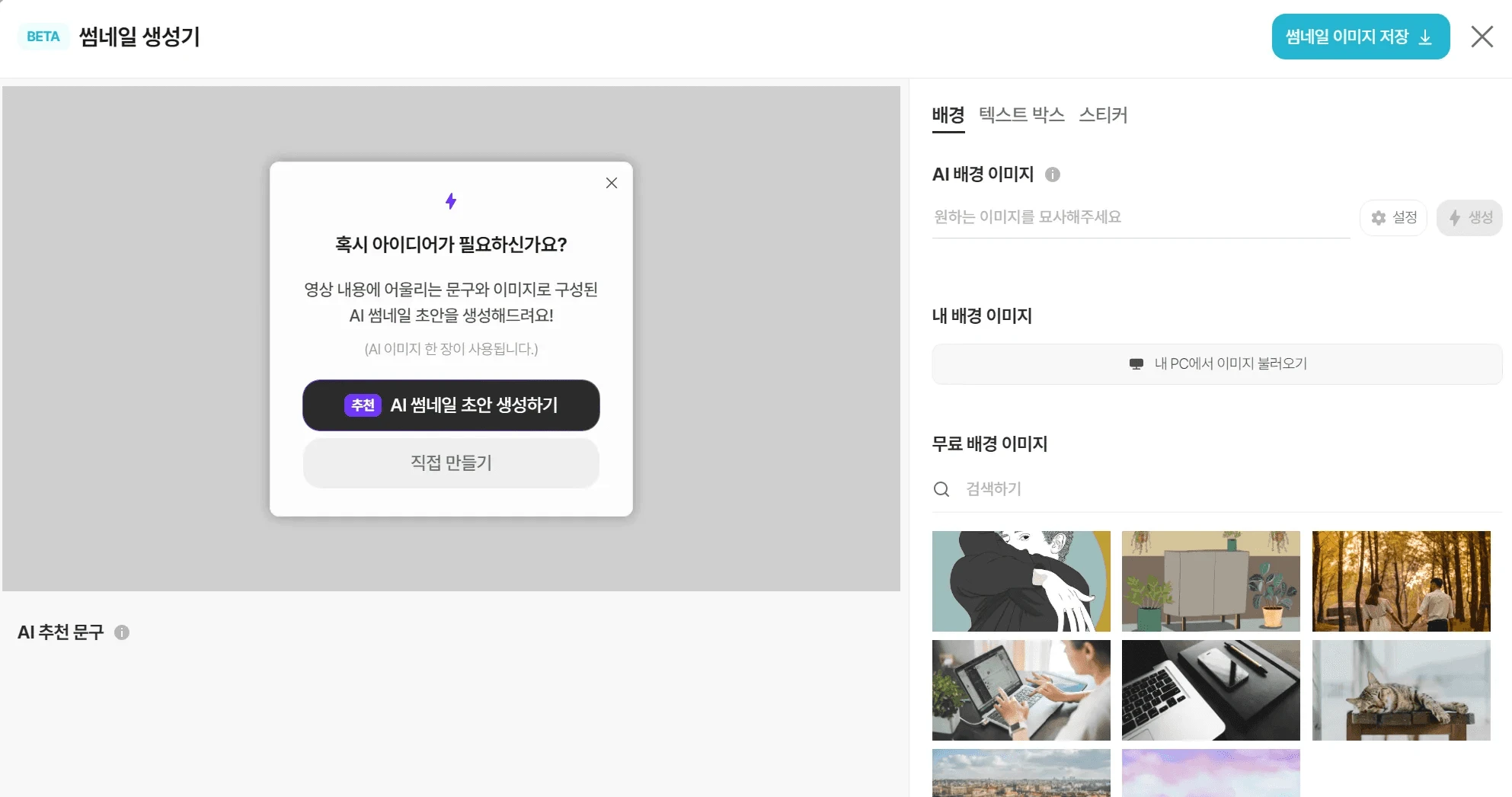 AI가 자동으로 썸네일을 추천해 주는 기능도 있고, 원하는 스타일이나 주제에 맞게 맞춤 제작을 요청할 수도 있으니, 이 기능을 활용해 한층 더 전문적인 썸네일을 만들어 보세요.