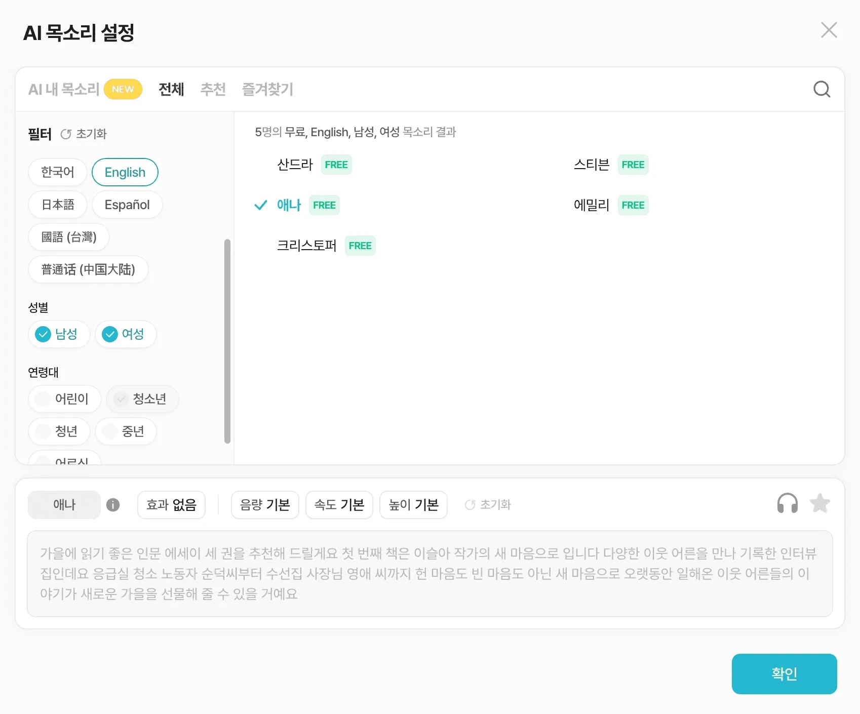 빠르게 진행되는 쇼츠 나레이션이 필요하다면, Vrew에 있는 500여 개의 AI 목소리를 다양한 분위기에 맞게 사용하실 수 있습니다. 특히 최근 국내 시장뿐 아니라 더 글로벌한 영상 도달을 위해 영어 자막을 쓰는 분들이 늘고 있는데요. Vrew의 영어 AI 목소리를 활용하면 비싼 비용을 지불하고 외국인 성우 녹음을 하지 않아도 무료로 자연스러운 쇼츠를 만들 수 있습니다.