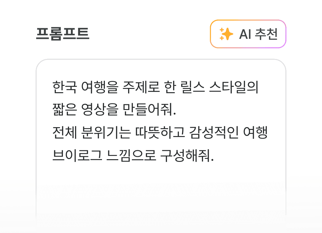 영상의 스타일, 언어, 말투, 강조 포인트까지 프롬프트로 직접 지정하거나, AI 추천 프롬프트를 골라 바로 적용할 수 있어요.