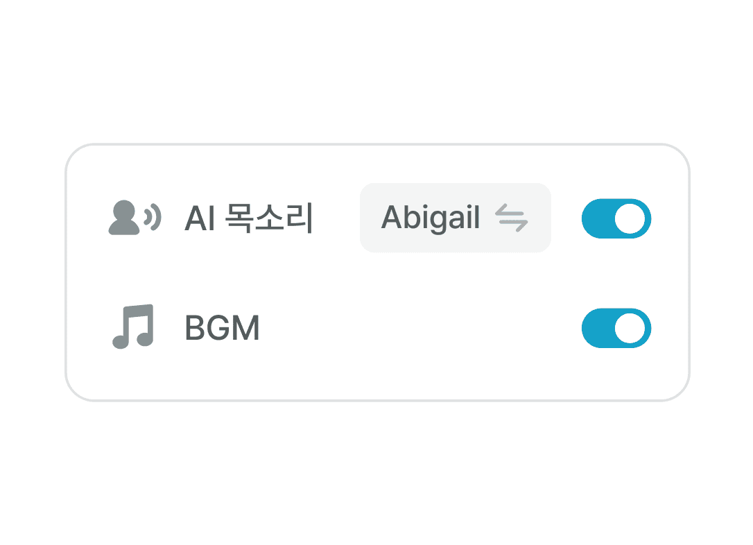 내레이션이 필요하다면 AI 목소리의 성별·톤·속도·언어를 선택해요. 배경음악도 고를 수 있어요.
