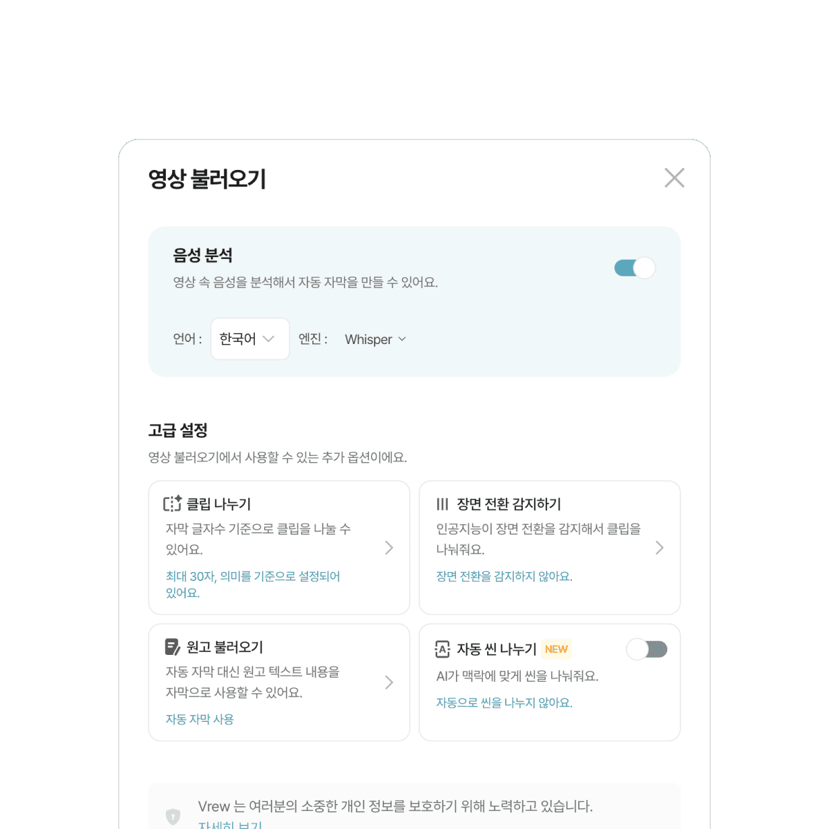 오디오가 긴 영상도 Vrew에 업로드만 하면, AI가 알아서 자막을 생성합니다. 영상을 반복해 보면서 자막 작업을 진행할 필요가 없어요.