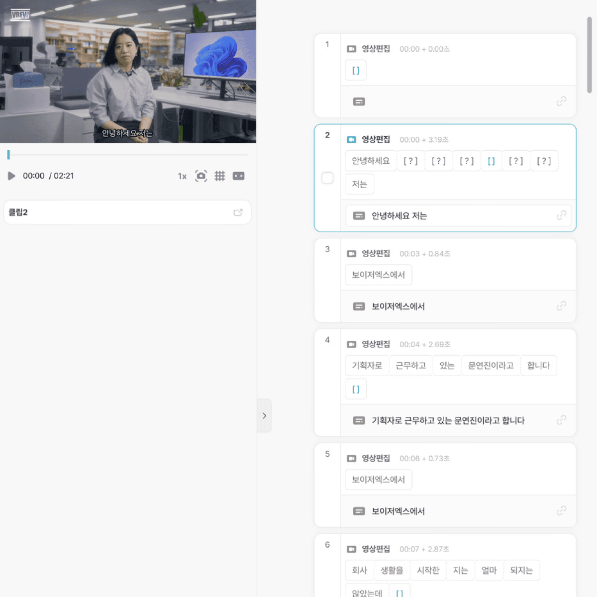 AI가 생성한 자막을 문장 단위로 보면서 컷 편집할 수 있습니다. 자막 텍스트를 보고 오디오와 영상을 한 번에 작업할 수 있어요! 음성과 영상을 선택한 부분만 듣고 편집할 수 있어요.