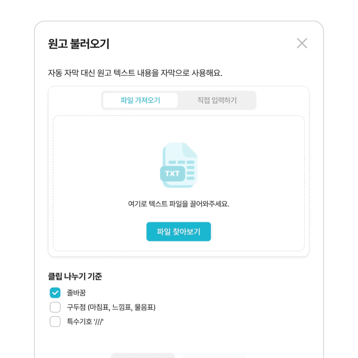이미 생성된 자막에도, 텍스트와 자막 파일을 업로드하여 퀄리티를 높일 수 있어요.
