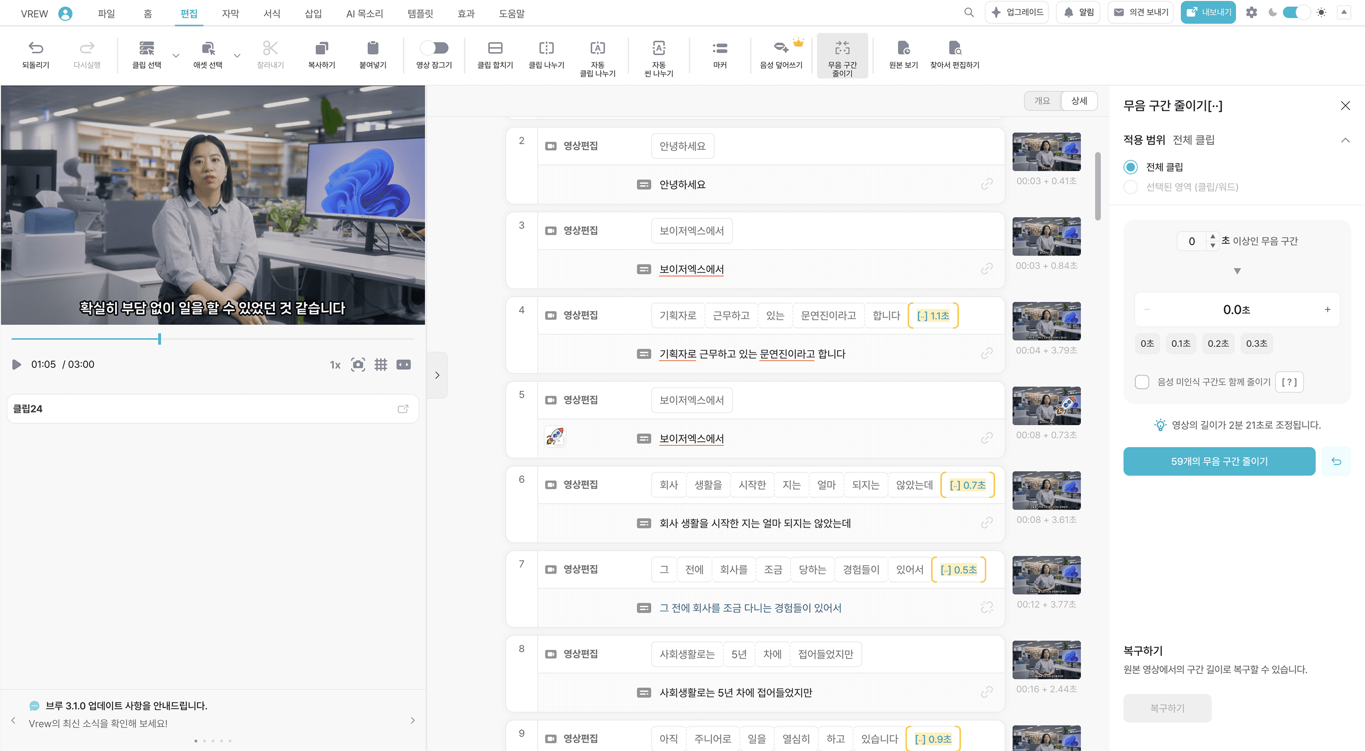 클립 내에서 [..]로 표시되는 무음 구간들을 한 번에 단축하거나 삭제할 수 있습니다.