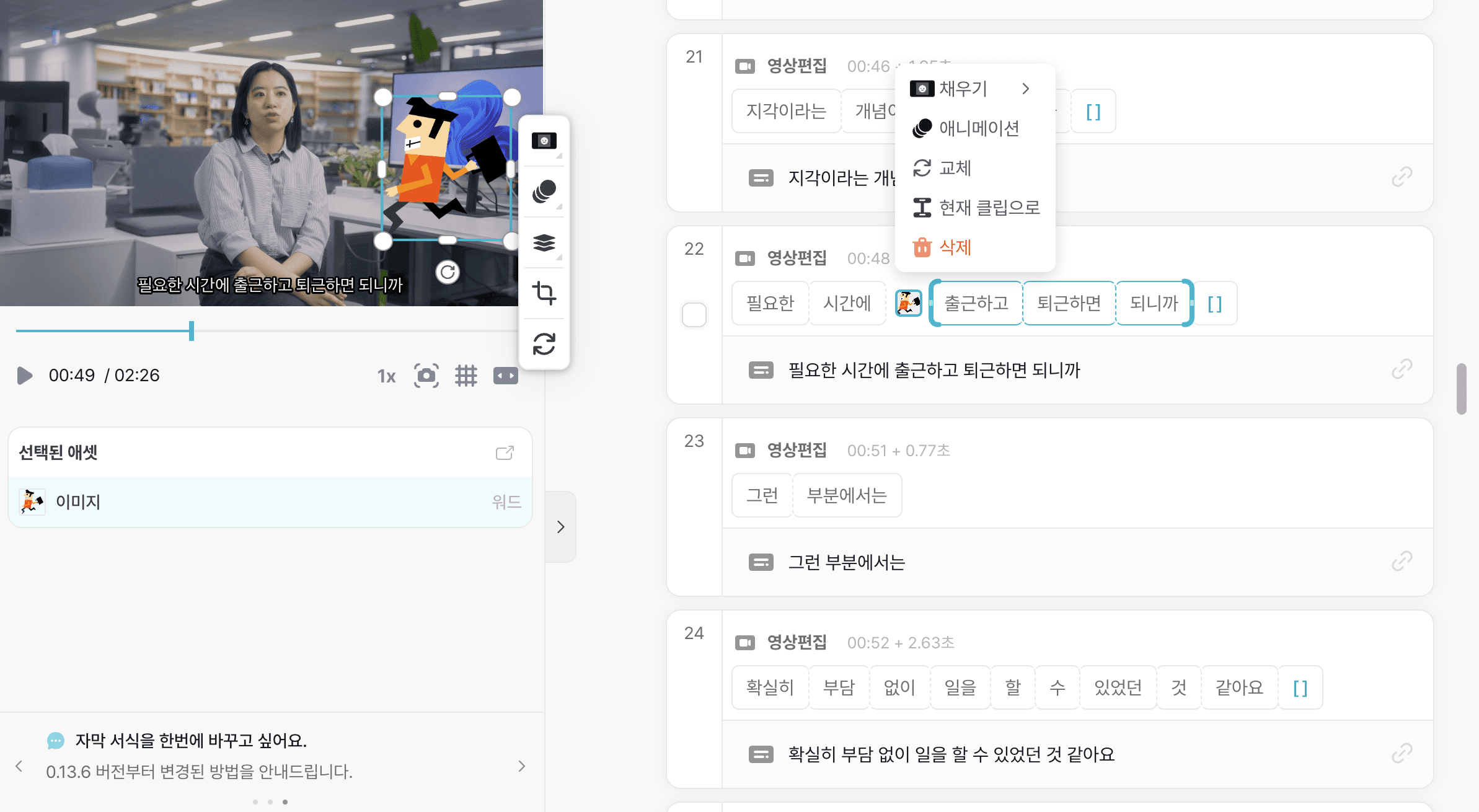 추가한 소재의 위치, 시간, 텍스트 등을