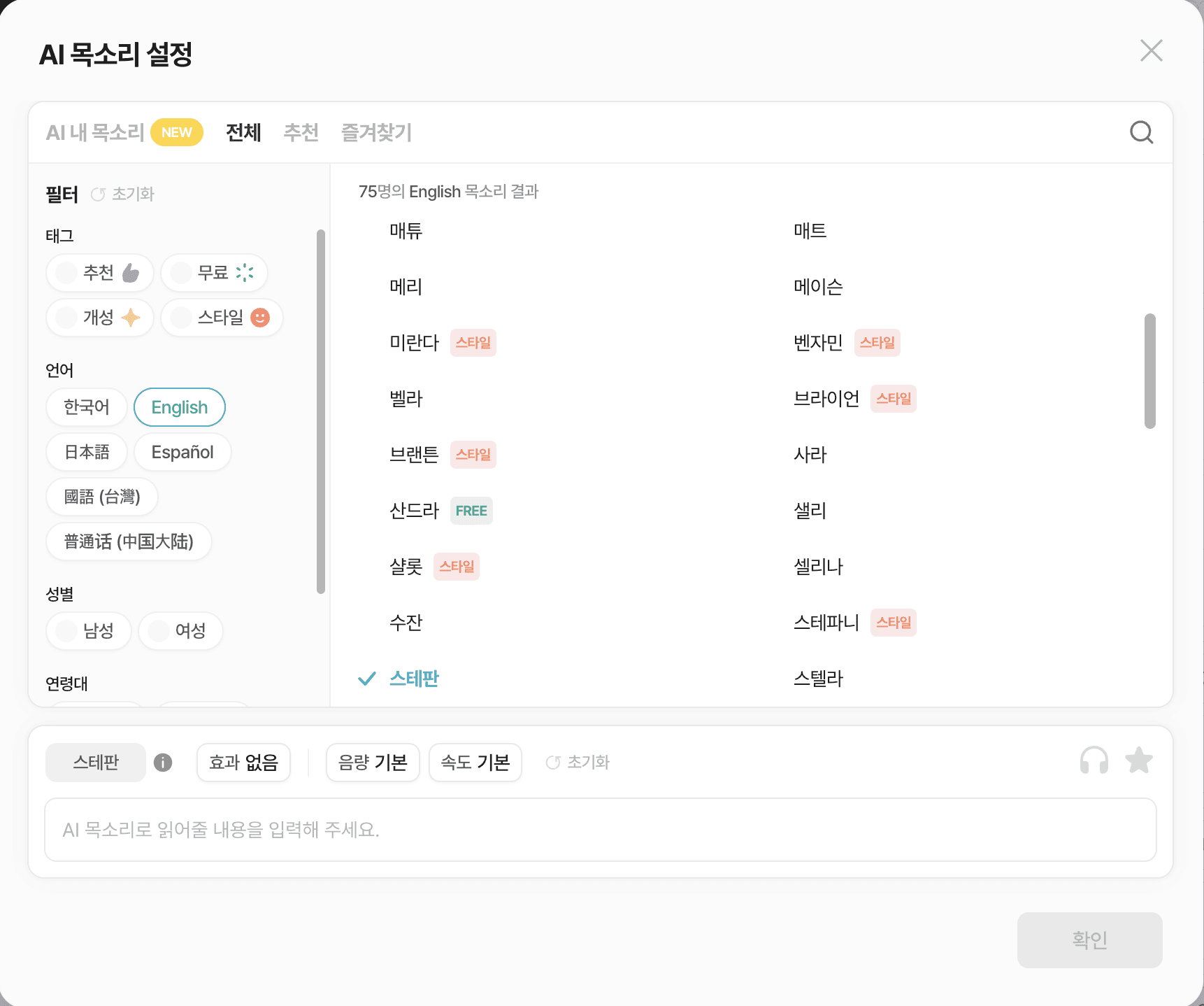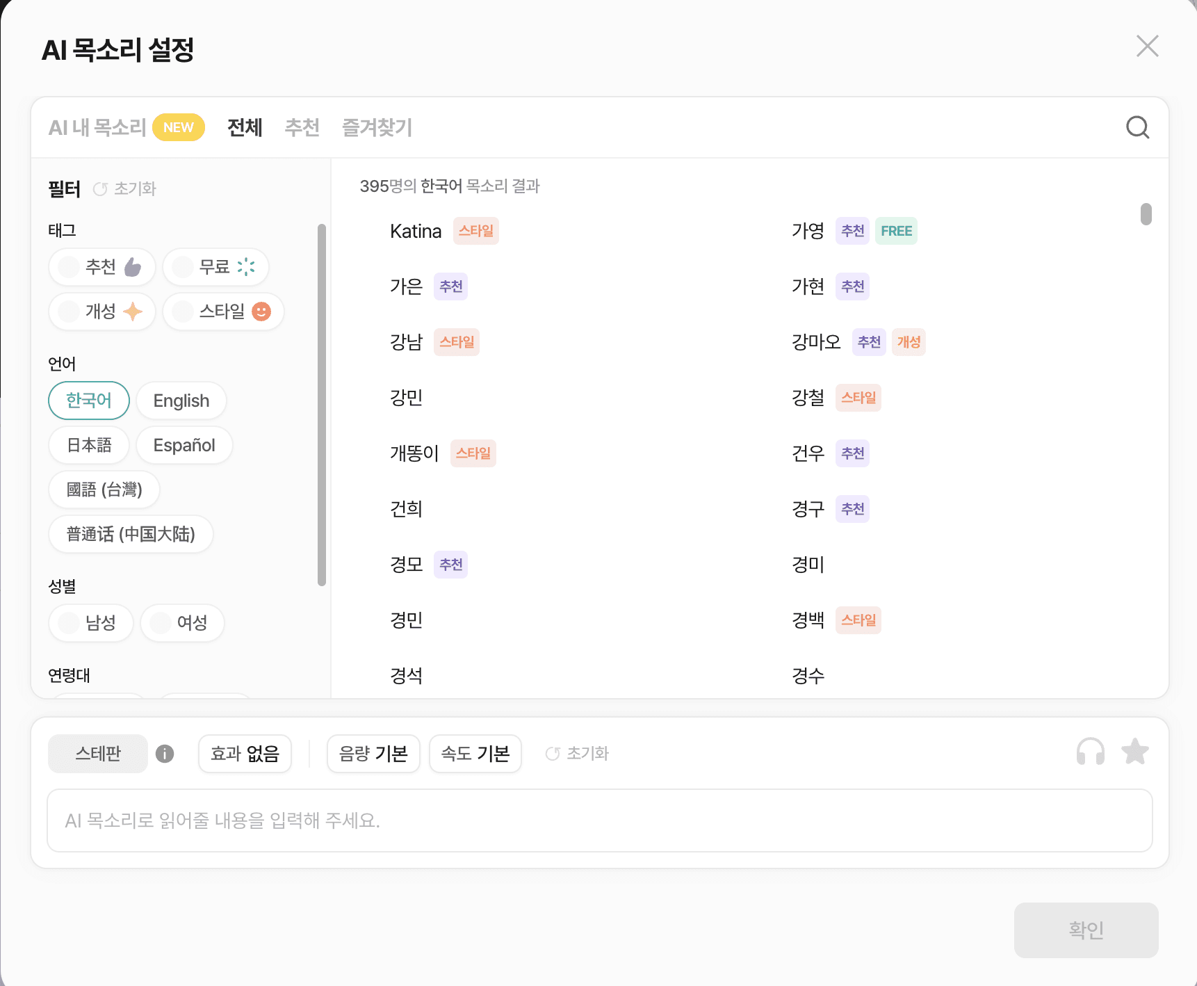 여성, 남성, 어린이, 어르신 등 65개 이상의 한국어 음성이 준비되어 있어요. 홈쇼핑, 악당, 이북 테마 목소리 등 영상의 컨셉에 맞는 목소리를 선택해 보세요!