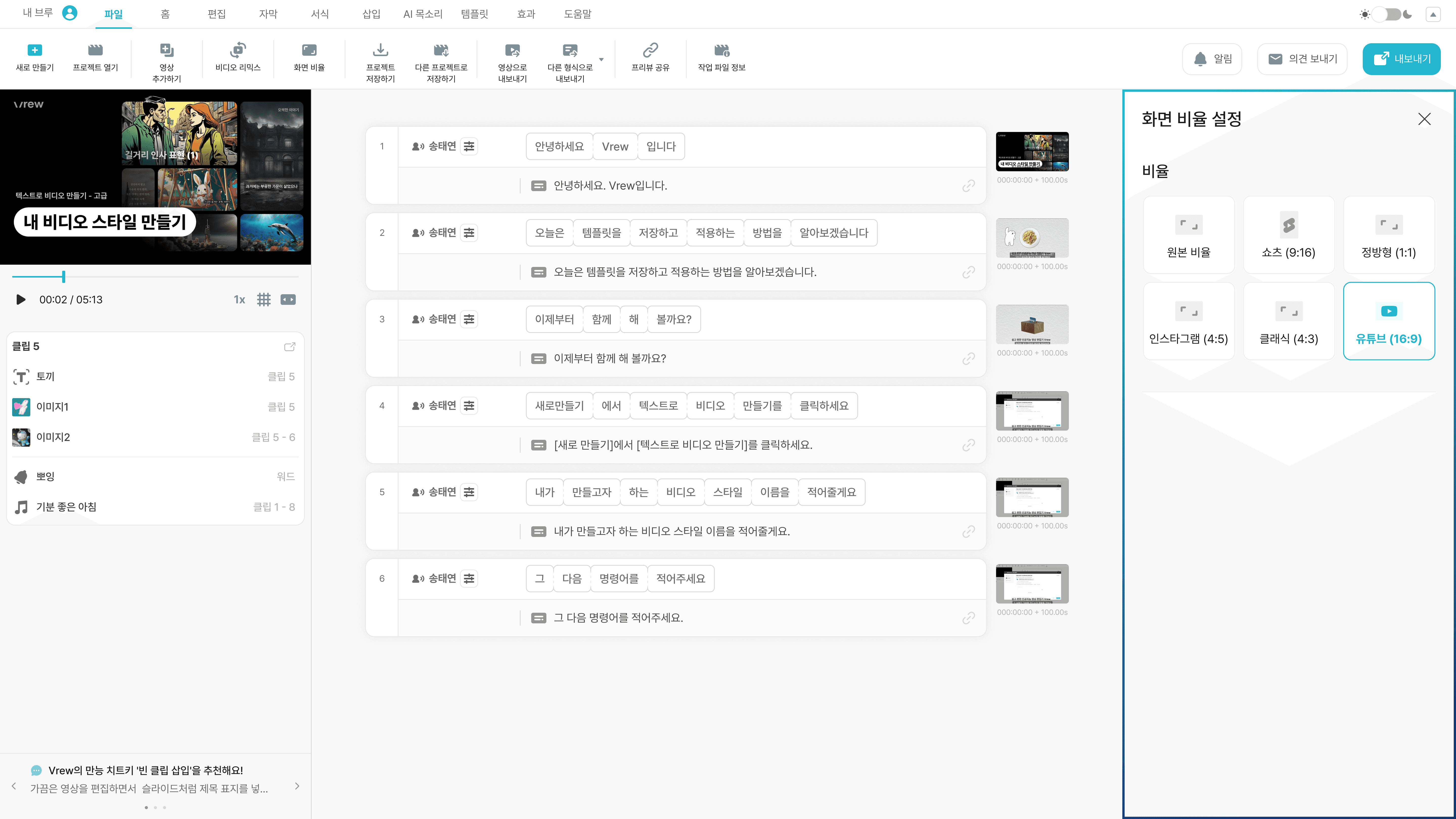 Vrew 원클릭 영상 비율 변경 기능